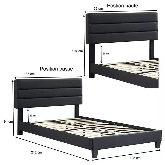- Kopfteil verstellbar: Mindesthöhe 94 cm, mittlere Höhe 99 cm, maximale Höhe 104 cm