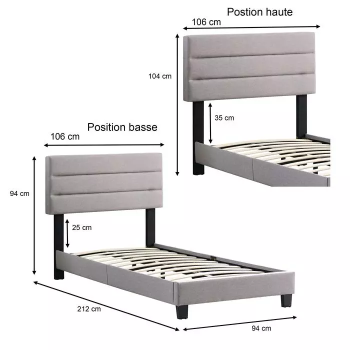 - Kopfteil verstellbar: Mindesthöhe 94 cm, mittlere Höhe 99 cm, maximale Höhe 104 cm