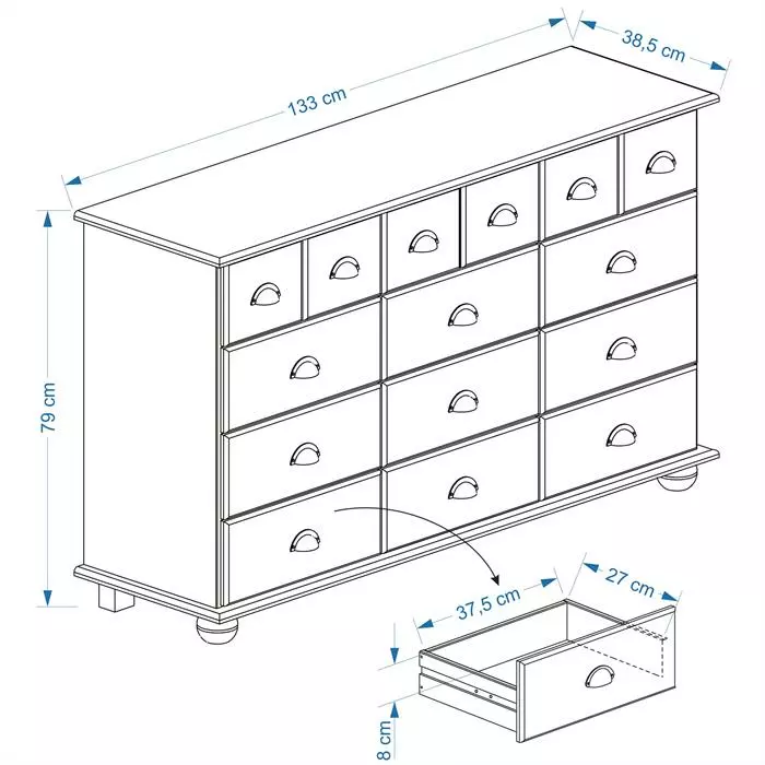 - 12 Schubladen, davon 3 in der Optik von je 2 kleinen