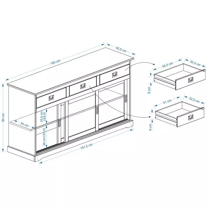- Aufbaumaß (B/H/T/): 160 x 84 x 44,5 cm